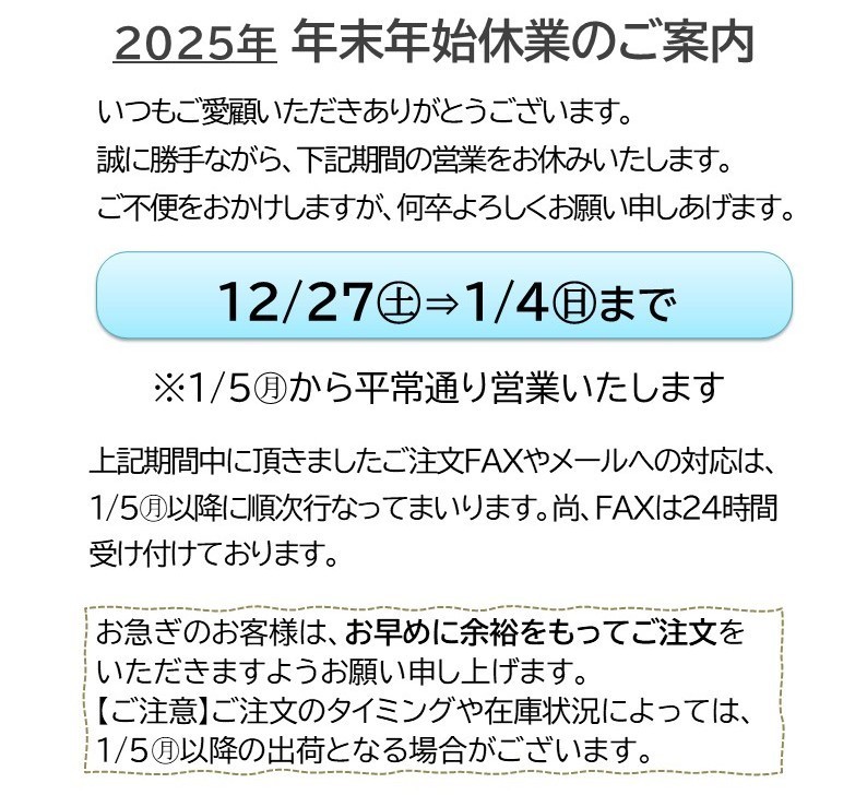 ■年末年始休業期間:12/27㊏⇒1/4㊐まで■