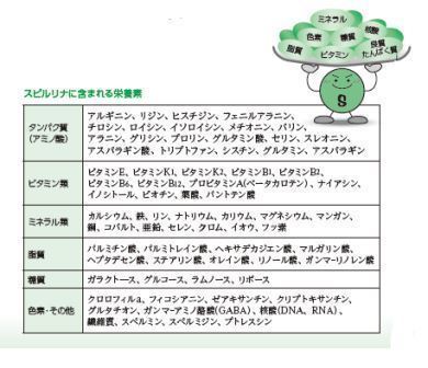 スピルリナには必須栄養素(ビタミン、ミネラル、アミノ酸)がバランスよく含まれています。また、健康な細胞に欠かせない「核酸」活性酸素を除去する「SOD酵素」元気の素「グリコーゲン」、抗アレルギー作用のある「ガンマ・リノレン酸」を天然の形で含む健康補助食品です。水中の緑黄色野菜とも呼ばれています。