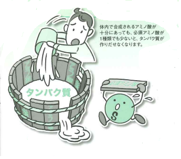 タンパク質を構成している20種類のアミノ酸のうち、イソロイシン・ロイシン・リジン・メチオニン・フェニルアラニン・スレオニン・トリプトファン・バリン・ヒスチジンの9種類は体内で